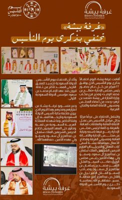 واشتمل الاحتفاء على عرضًا مرئيًا يحاكي مراحل التأسيس من عمل الأمانة العامة والعلاقات العامة بالغرفة، و كلمة لرئيس مجلس الإدارة رفع فيها باسمه ونيابة عن مجلس الإدارة والأمانة العامة ومنسوبي الغرفة وقطاع الأعمال بمحافظة بيشة أسمى آيات التهاني والتبريكات لخادم الحرمين الشريفين الملك سلمان بن عبدالعزيز آل سعود، وسمو ولي عهده الأمين رئيس مجلس الوزراء صاحب السمو الملكي الأمير محمد بن سلمان بن عبدالعزيز آل سعود، وصاحب السمو الملكي الأمير تركي بن طلال بن عبدالعزيز أمير منطقة عسير ـ حفظهم الله ـ بمناسبة ذكرى يوم التأسيس للدولة السعودية.