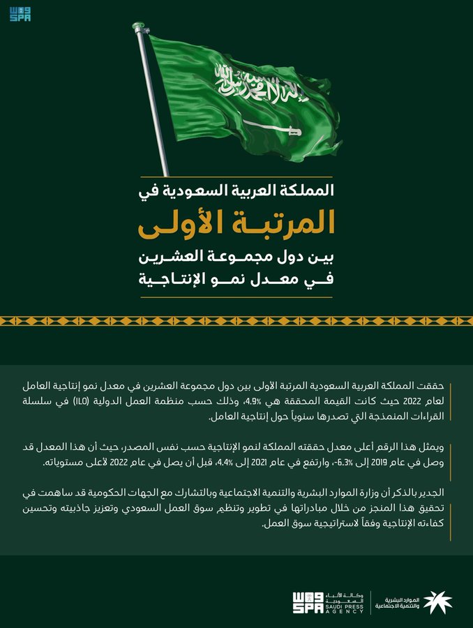 حققت المملكة العربية السعودية المرتبة الأولى بين دول مجموعة العشرين في معدل نمو إنتاجية العامل لعام 2022 حيث كانت القيمة المحققة هي %4.9، وذلك حسب منظمة العمل الدولية (ILO) في سلسلة القراءات المنمذجة التي تصدرها سنوياً حول إنتاجية العامل.