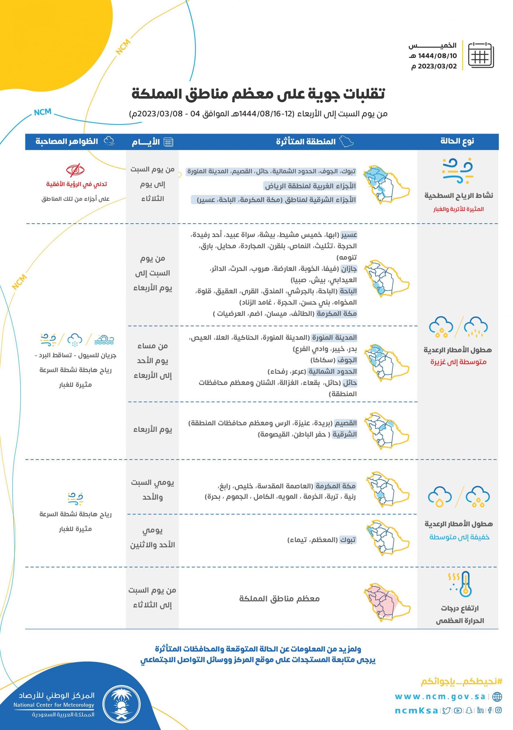 توقَّع المركز الوطني للأرصاد، في تقرير له، أن تشهد معظم مناطق المملكة تقلبات جوية بدءًا من يوم السبت المقبل إلى يوم الأربعاء الموافق 08 مارس 2023م، تشمل تأثيراتها المصاحبة نشاطاً للرياح السطحية المثيرة للأتربة والغبار، المصحوبة بتدنٍّ في مدى الرؤية الأفقية، وذلك على مناطق تبوك، والجوف، والحدود الشمالية، وحائل، والقصيم، والمدينة المنورة، إضافة إلى الأجزاء الغربية لمنطقة الرياض، والأجزاء الشرقية لمناطق مكة المكرمة، والباحة، وعسير.