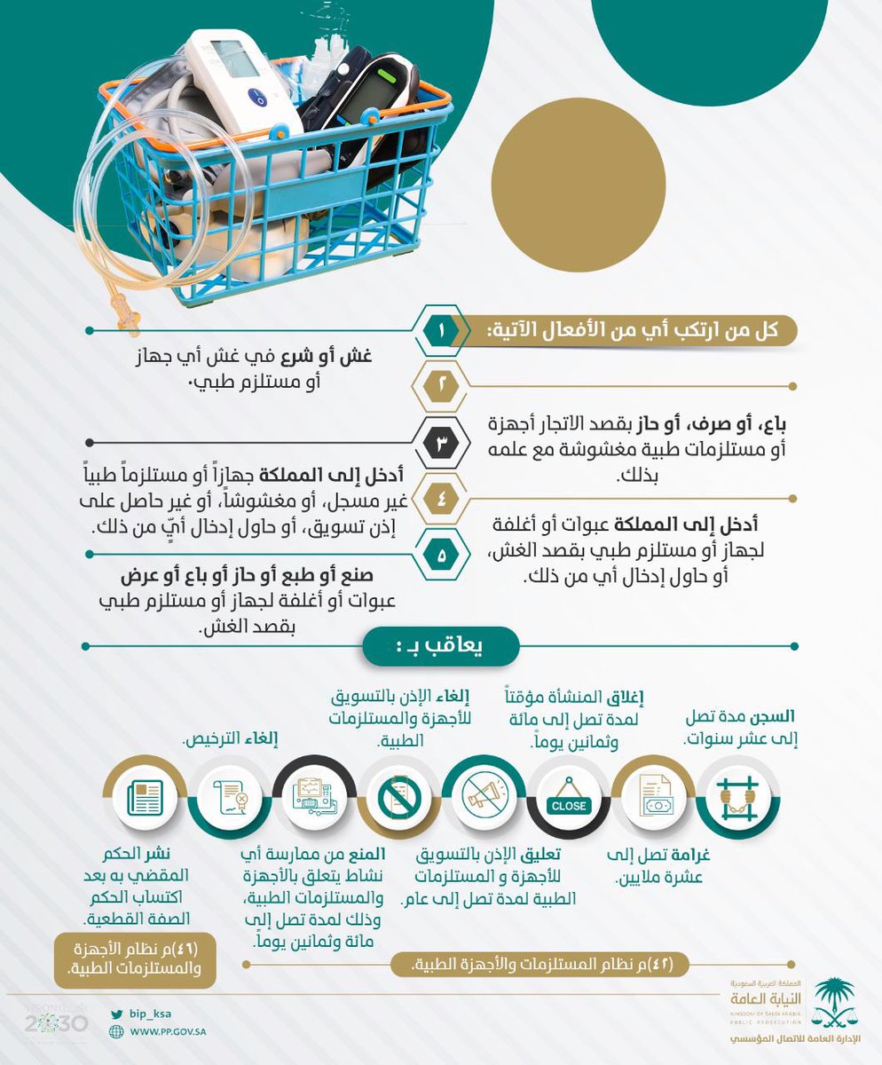وقالت النيابة العامة عبر حسابها الرسمي على تويتر: “كل من غش أو شرع في غش أي جهاز أو مستلزم طبي أو باع أو صرف أو حاز بقصد الاتجار أجهزة أو مستلزمات طبية مغشوشة مع علمه بذلك، أو أدخل إلى المملكة جهازاً أو مستلزماً طبياً غير مسجل، أو مغشوشاً أو غير حاصل على إذن تسويق، أو حاول إدخال أيّ من ذلك، أو أدخل إلى المملكة عبوات او أغلفة لجهاز أو مستلزم طبي بقصد الغش أو حاول إدخال أي من ذلك، أو صنع أو طبع أو حاز أو باع أو عرض عبوات أو أغلفة لجهاز أو مستلزم طبي بقصد الغش، يعاقب بالسجن مدة تصل إلى عشر سنوات، وبغرامة تصل إلى عشر ملايين ريال، مع إغلاق المنشأة مؤقتاً لمدة تصل إلى مائة وثمانين يوماً”.