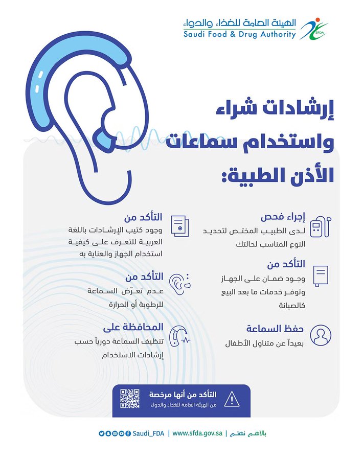 نصحت هيئة الغذاء والدواء باتباع عددٍ من الإرشادات قبل شراء السمّاعات الطبية، أبرزها إجراء فحص لدى الطبيب المختص لتحديد النوع المناسب للحالة، والتأكّد من وجود ضمانٍ على الجهاز، وخدمات ما بعد البيع والصيانة.