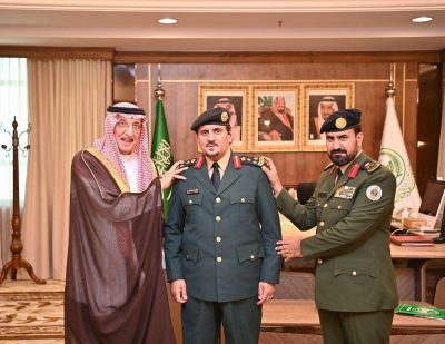 قلد صاحب السمو الملكي الأمير محمد بن ناصر بن عبد العزيز أمير منطقة جازان، بمكتبه في الإمارة اليوم، مدير إدارة العمليات بمديرية السجون بالمنطقة العميد محمد بن هادي حكمي، ومدير مراقبة المخزون بالمديرية العميد إبراهيم بن محمد العمري ، رتبتيهما الجديدتين، بعد صدور الأمر السامي الكريم بترقيتهما .