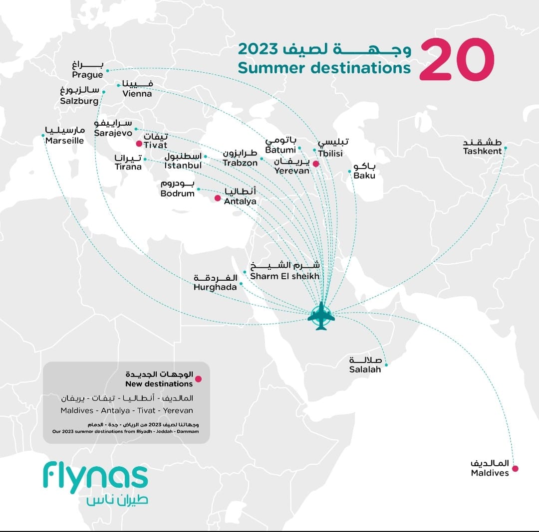 وكشف طيران ناس أن وجهاته الجديدة ستضم جزر المالديف، ويريفان في أرمينيا، وأنطاليا في تركيا، وتيفات في مونتينيغرو “الجبل الأسود” “كأربع وجهات جديدة ومباشرة من مطار الملك خالد الدولي في الرياض، مشيراً إلى أنه سيشغّل أيضاً ستة خطوط سير جديدة، أربعة منها من الدمام إلى كل من صلالة في سلطنة عمان واسطنبول وطرابزون في تركيا والعاصمة الألبانية تيرانا، بالإضافة إلى خطي سير من جدة إلى بودروم في تركيا وصلالة.