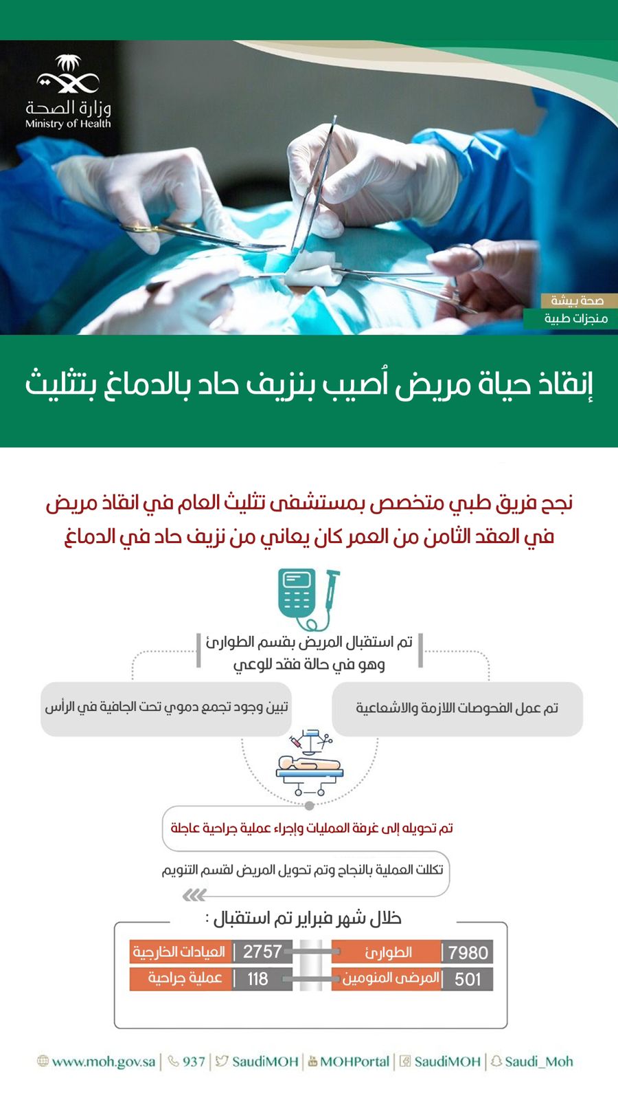 وتفصيلاً ، قالت صحة بيشة أنه تم استقبال المريض بقسم الطوارئ وهو في حالة فقد للوعي وبعد عمل الفحوصات اللازمة تبيّن وجود تجمع دموي تحت الجافية في الجهة اليمنى من الرأس ، قرر الفريق الطبي تحويله إلى غرفة العمليات وإجراء عملية جراحية عاجلة.