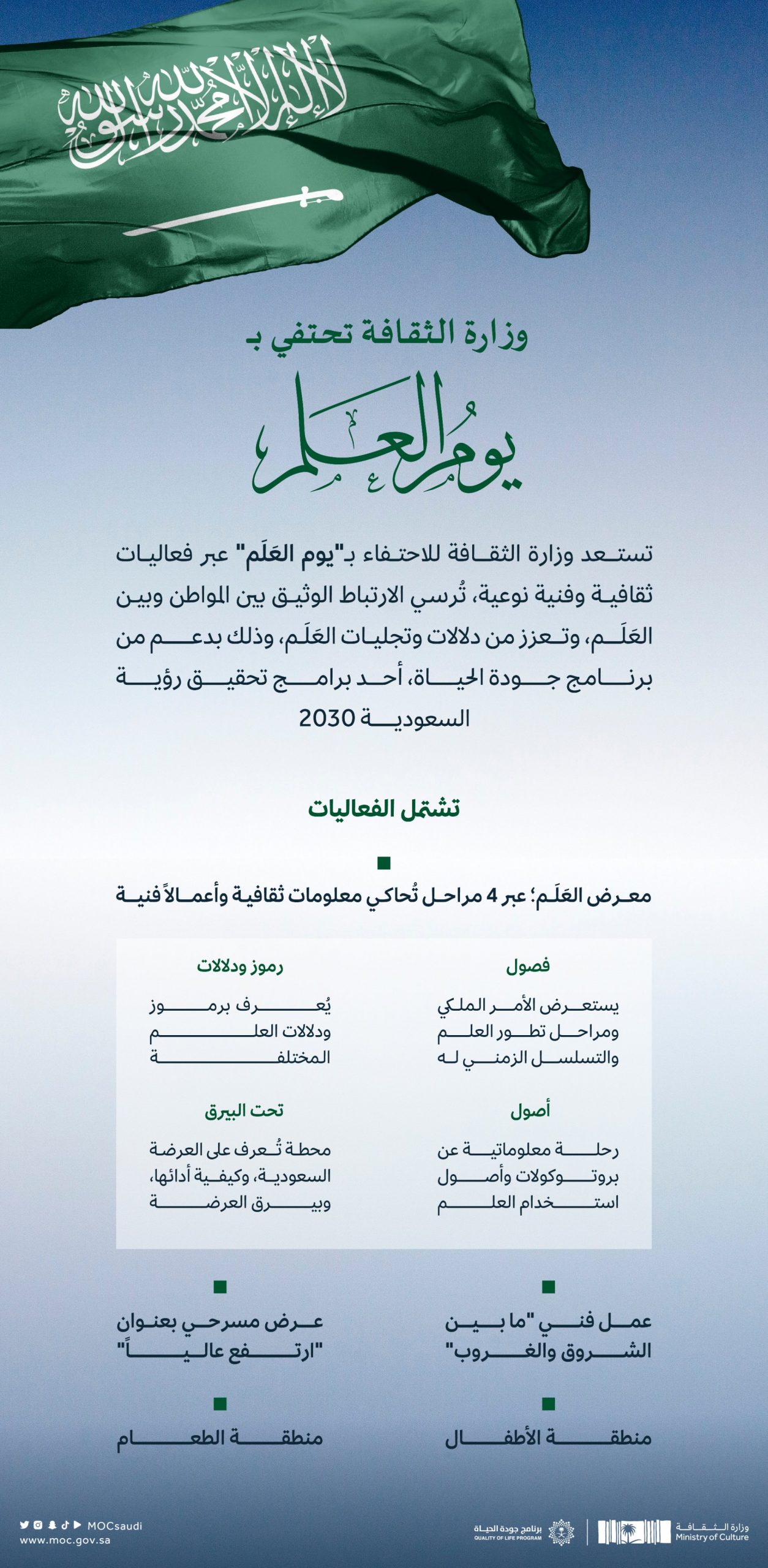 تستعد وزارة الثقافة للاحتفاء بــ”يوم العَلَم” عبر فعاليات ثقافية وفنية نوعيّة تُقام في ساحة العدل بجانب قصر الحكم والمصمك التاريخي بالرياض، خلال الفترة من 11 إلى 13 مارس الحالي ، تُرسي من خلالها الوزارة الارتباط الوثيق بين المواطن وبين العَلَم، وتعزز من دلالات وتجليات العَلَم، وذلك بدعمٍ من برنامج جودة الحياة، أحد برامج تحقيق رؤية السعودية 2030، ويمكن الحصول على تذاكر الفعالية عبر الرابط الإلكتروني: https://mocevents.ticketmx.com/ar/d/3191/flag-day/9ada7118ad894f42a921 .