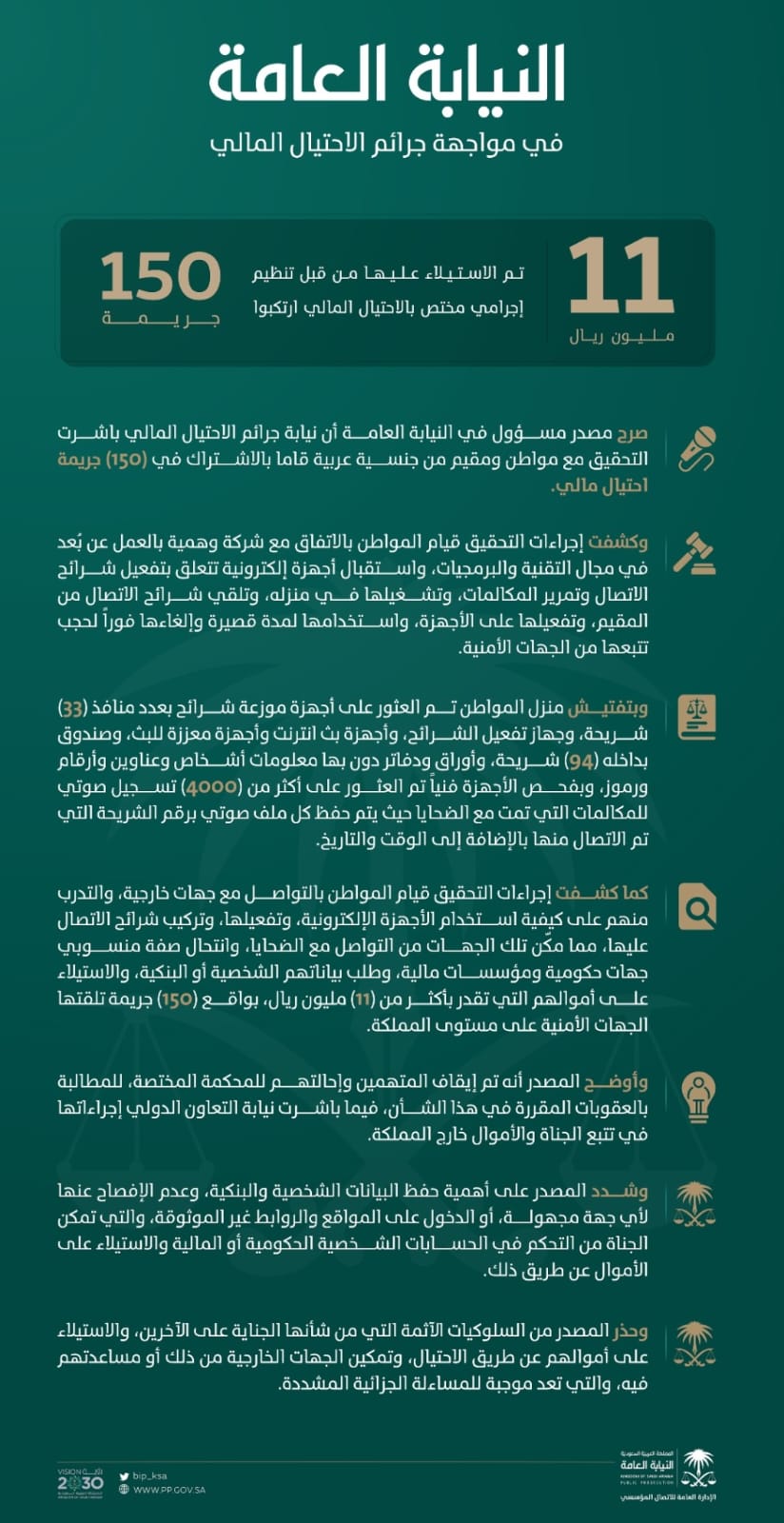 كما كشفت إجراءات التحقيق قيام المواطن بالتواصل مع جهات خارجية، والتدرب منهم على كيفية استخدام الأجهزة الإلكترونية، وتفعيلها، وتركيب شرائح الاتصال عليها، مما مكّن تلك الجهات من التواصل مع الضحايا، وانتحال صفة منسوبي جهات حكومية ومؤسسات مالية، وطلب بياناتهم الشخصية أو البنكية، والاستيلاء على أموالهم التي تقدر بأكثر من (١١) مليون ريال، بواقع (١٥٠) جريمة تلقتها الجهات الأمنية على مستوى المملكة.