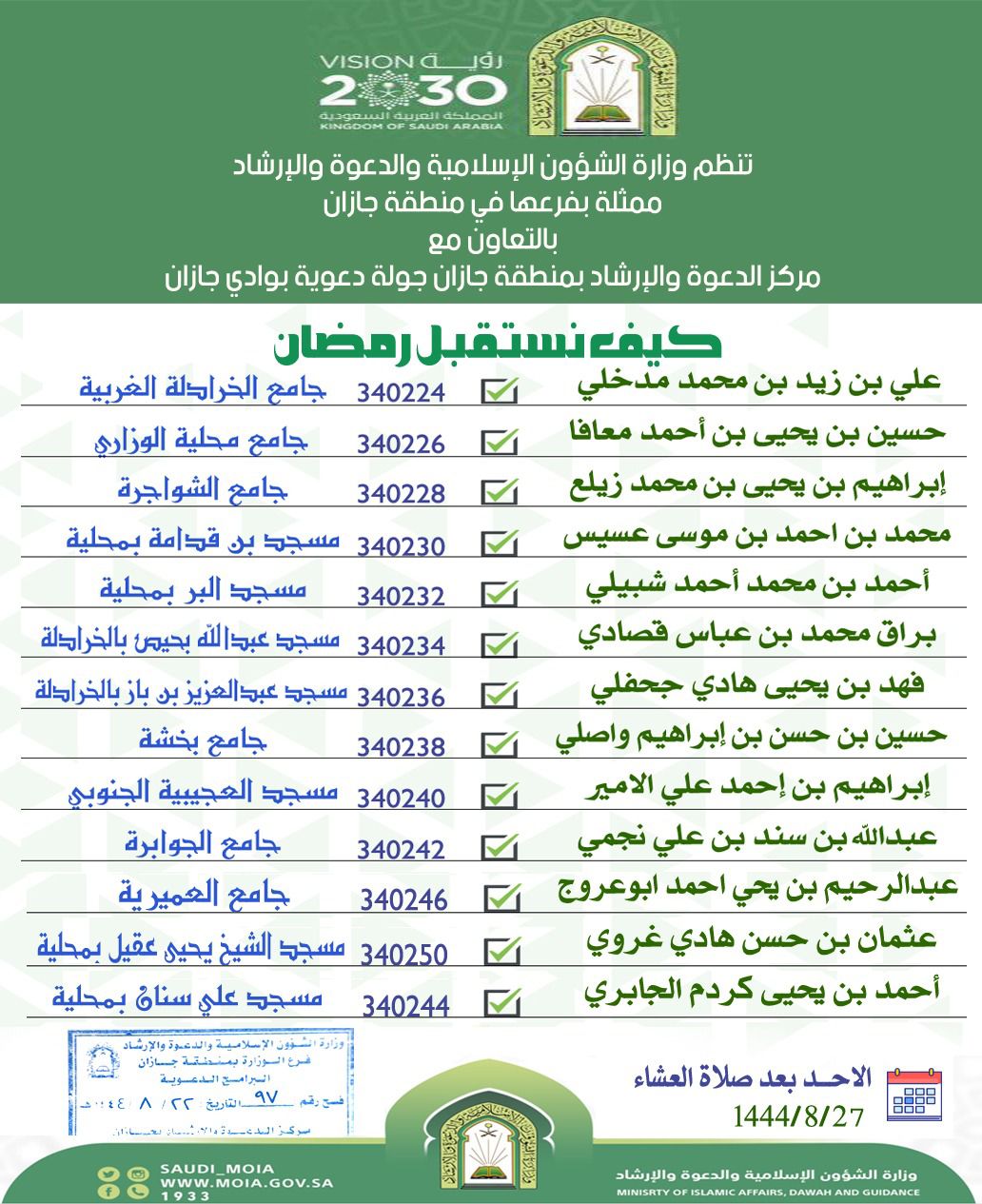 نظمت الشؤون الإسلامية ممثلةً بفرعها بمنطقة جازان ” مركز دعوة جازان ” مساء الأحد 27 / 8 / 1444 هـ , جولة دعوية بمركز وادي جازان والتي جاءت بعنوان ” كيف نستقبل رمضان ” وتناولت الجولة في مُجمل حديثها عن ؛ المبادرة إلى التوبة الصادقة وكثرة الاستغفار والذكر وتلاوة القرآن وعقد العزم الصادق على عمارة أوقات رمضان بالأعمال الصالحة , اُقيمت الجولة في ؛ جامع الخرادلة الغربية وجامع محلية الوزاري وجامع الشواجرة ومسجد بن قدامة بمحلية ومسجد البر بمحلية ومسجد عبدالله بحيص بالخرادلة ومسجد عبدالعزيز بن باز بالخرادلة وجامع بخشة ومسجد العجيبية الجنوبي وجوامع الجوابرة وجامع العميرية ومسجد الشيخ يحيى عقيل بمحلية ومسجد علي سنان بمحلية .