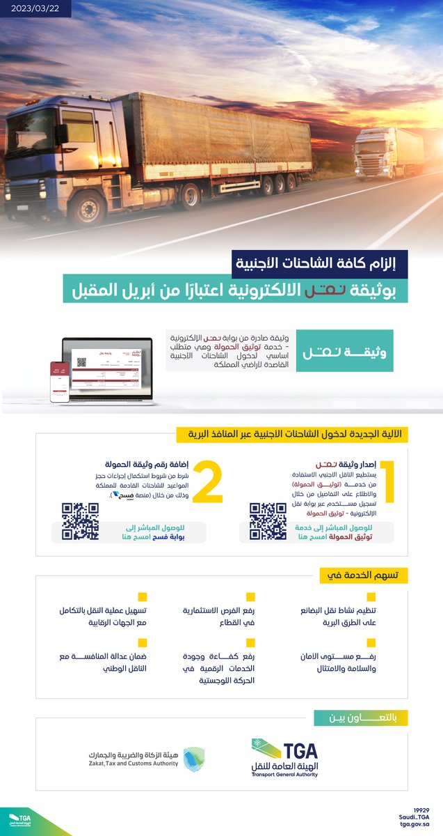 وبيّنت أن وثيقة نقل التي يتم إصدارها من خلال بوابة نقل الإلكترونية عبر خدمة “توثيق الحمولة” وتشتمل على بيانات المرسل والمُرسل إليه، ومعلومات الشحنة، وجدول المنقولات، وكذلك تفاصيل الرحلة ومساراها وبيانات الناقل، تعد متطلبًا أساسيًا لدخول الشاحنات غير السعودية إلى المملكة.