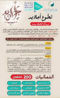 ينطلق في منتصف شهر رمضان المبارك في محافظة بيشة برنامح ” تطوع أجاويد” وهو برنامج توعوي تثقيفي وتفاعلي يستهدف شباب وشابات بيشة .