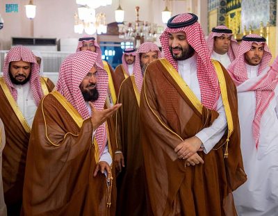 وكان في استقبال سمو ولي العهد لدى وصوله الحرم النبوي، معالي الرئيس العام لشؤون المسجد الحرام والمسجد النبوي الشيخ الدكتور عبدالرحمن بن عبدالعزيز السديس، وأصحاب الفضيلة أئمة وخطباء ومساعدي الرئيس لشؤون المسجد النبوي.