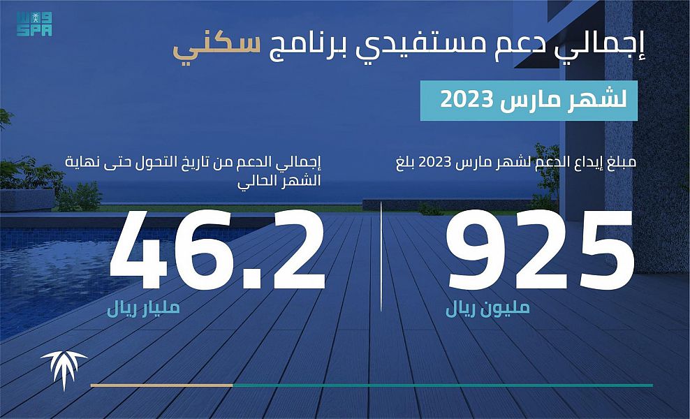 وبين الرئيس التنفيذي للصندوق منصور بن ماضي، أن إجمالي الدعم لشهر مارس الحالي جرى تخصيصه دعماً لأرباح عقود برامج الدعم السكني المتنوعة، مشيراً إلى أن إجمالي ما تم إيداعه في حسابات مستفيدي سكني منذ إعلان برنامج التحّول في يونيو 2017 حتى مارس 2023، تجاوز 46.2 مليار ريال.