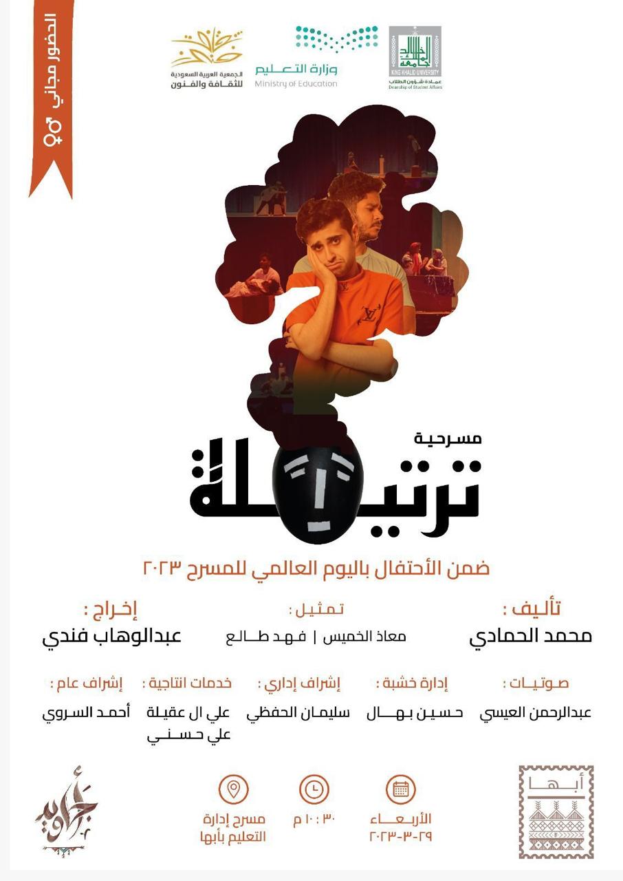 تواصل جمعية الثقافة والفنون بأبها غدا إحتفاءها باليوم العالمي للمسرح بعرص مسرحية ترتيلة على مسرح إدارة التعليم بمنطقة عسير ضمن مبادرة أجاويد في مسار وعي.