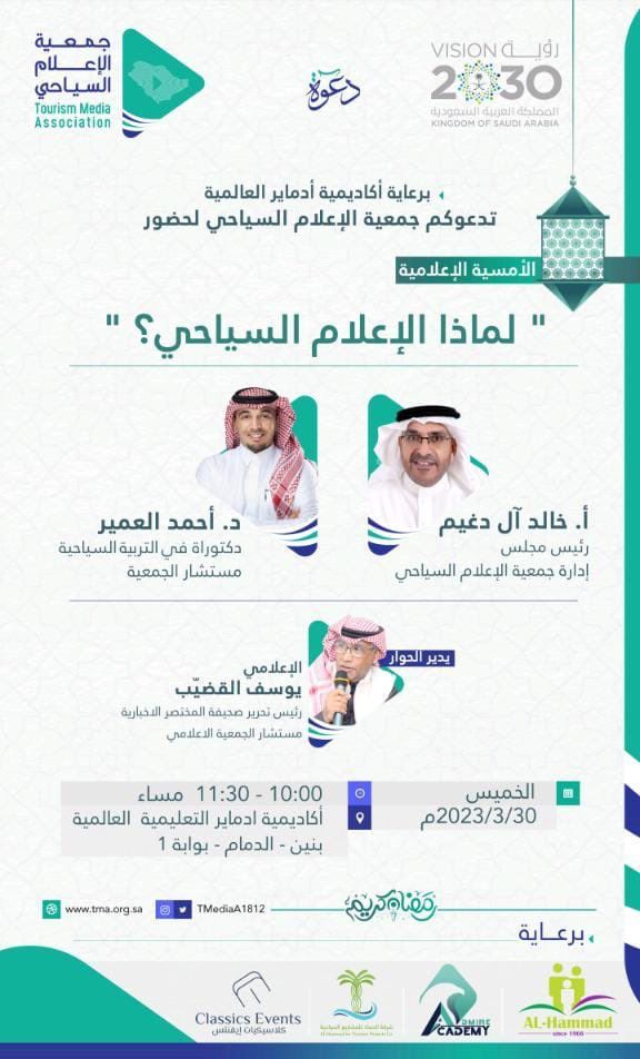 تنفذ جمعية الإعلام السياحي في تمام العاشرة من مساء يوم غدا الخميس 8 رمضان الجاري 1444هـ الموافق 30 مارس 2023بمدينة الدمام أمسية رمضانية إعلامية بعنوان : لماذا الإعلام السياحي ؟