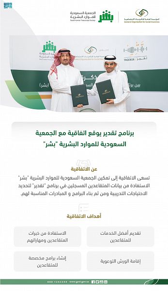 وتسعى الاتفاقية إلى تمكين الجمعية السعودية للموارد البشرية “بشر” الاستفادة من بيانات المتقاعدين المسجلين في برنامج “تقدير” لتحديد الاحتياجات التدريبية ومن ثم بناء البرامج و المبادرات المناسبة لهم.