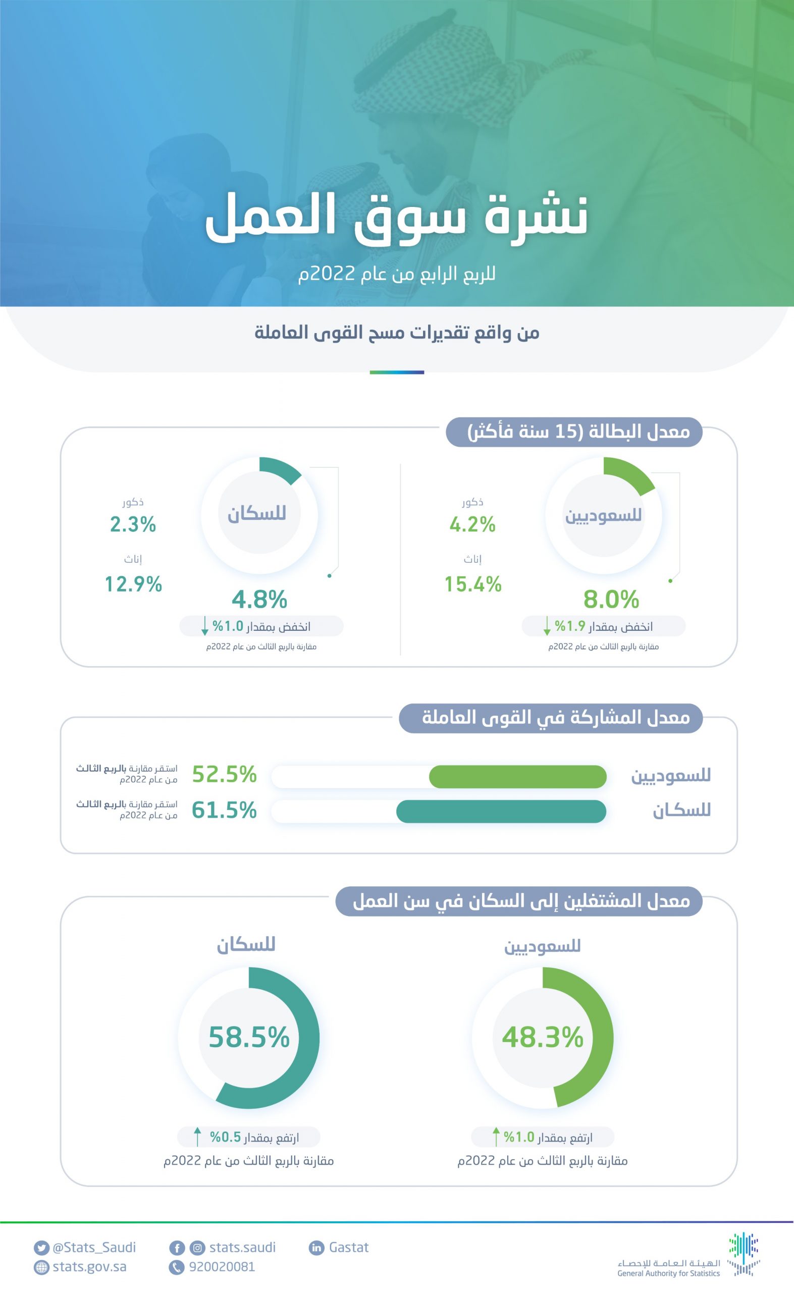 وتأتي هذه النتائج الإيجابية مُترافقةً مع تحقيق الاقتصاد السعودي لأعلى نمو في الناتج المحلي بنسبة 8.7 %، كأعلى معدلات النمو بين دول مجموعة العشرين، فيما يأتي انخفاض معدلات بطالة السعوديين متوافقًا مع نتائج مؤشر PMI الخاص بمسح التوظيف خلال شهر ديسمبر 2022م؛ حيث شهد نموًا قويًا في تسارع وتيرة خلق فرص العمل، وسجلت قراءة المؤشر 52 نقطة وهي الأعلى خلال الخمس سنوات الماضية منذ يناير 2018، في حين يؤكد ارتفاع معدل المشاركة في القوى العاملة للسعوديين جاذبية سوق العمل ودوره في توظيف واستيعاب السعوديين، حيث وصلت أعداد المُشتغلين إلى رقم قياسي بلغ 2.2 مليون مواطن ومواطنة مسجلين في نظام التأمينات الاجتماعية.