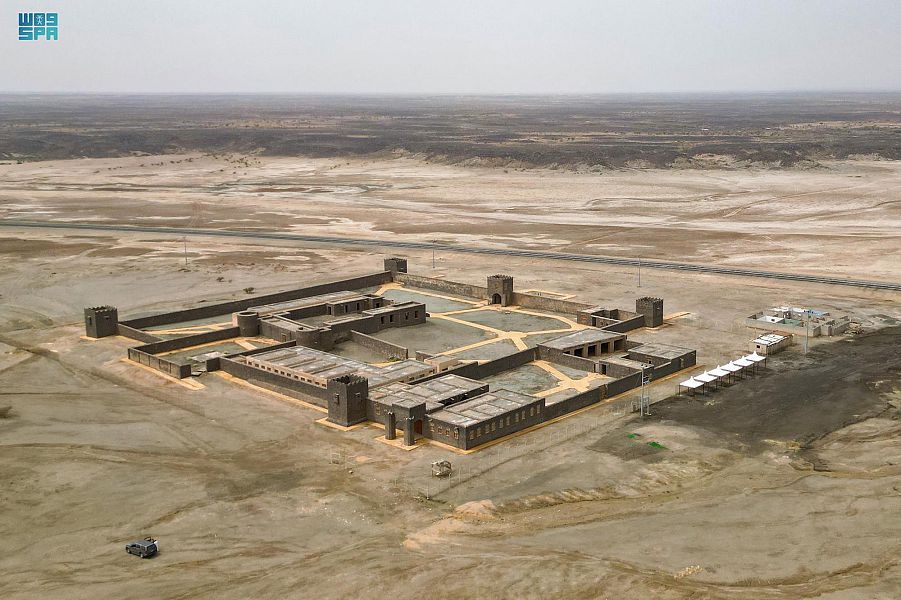 ويحيط القصر أسوار رصت صفوفها بالحجارة الصماء الصلبة بلونها الأسود الداكن على ارتفاع 4.5 م وسمك 100 سنتيمتر، حيث اعتمد في بنائه على تطبيق هوية المكان والأرض المحيطة به، وخطط على نمط القصور السعودية العتيقة قديماً، حيث يمثل القصر تحفة معمارية نوعية، مصحوبًا بموقع يتوسط القرى والهجر المجاورة، ويحاذي في استقامته طرق الحجاج بين المويه القديم والمويه الجديد، فهو مقرًا لجلالته أثناء زياراته بين نجد و الحجاز.