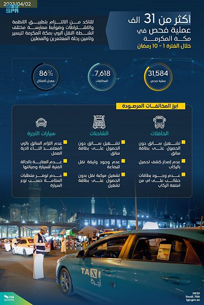 أجرت الهيئة العامة للنقل أكثر من 44 ألف عملية فحص ميدانية منذ بداية شهر رمضان المبارك في المدينة المنورة ومكة المكرمة، وذلك بهدف التأكد من الالتزام بتطبيق الأنظمة والاشتراطات وضوابط ممارسة مختلف أنشطة النقل البري، وتيسير وتأمين رحلات المعتمرين وضيوف الرحمن.