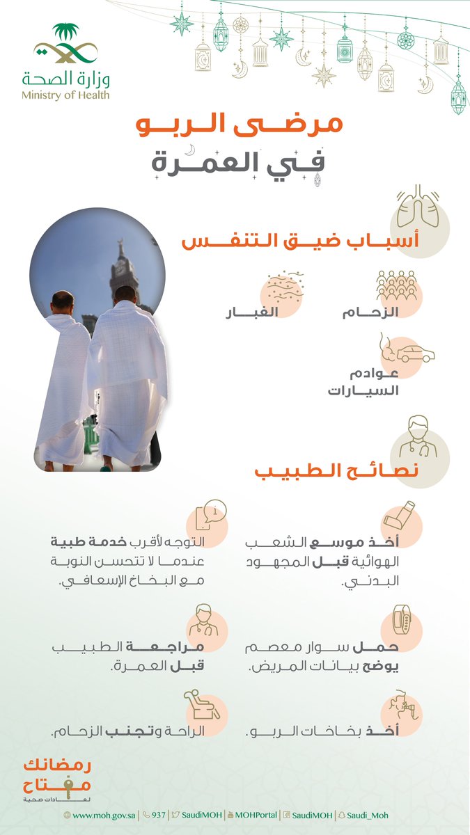 نصحت وزارة الصحة مرضى الربو المعتمرين، باتباع مجموعة من الإجراءات أثناء تأدية العمرة، لتقليل احتمالية حدوث ضيق التنفس بسبب الزحام والغبار وعوادم السيارات.