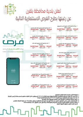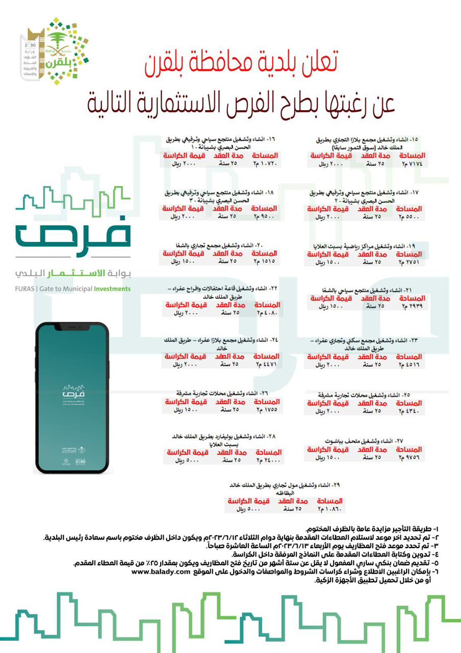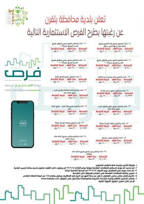 من جهته أوضح رئيس بلدية محافظة بلقرن المهندس / عوض بن ملفي القحطاني بأن هذه المشاريع تأتي ضمن جهود البلدية لفتح باب تنوع في مجالات الاستثمار بالمحافظة، وذلك بهدف تطوير عجلة التنمية بالمحافظة، داعياً الراغبين التقدم على هذه المشاريع الدخول على بوابة الاستثمار منصة “فرص” والاطلاع على تفاصيلها بكل سهولة.