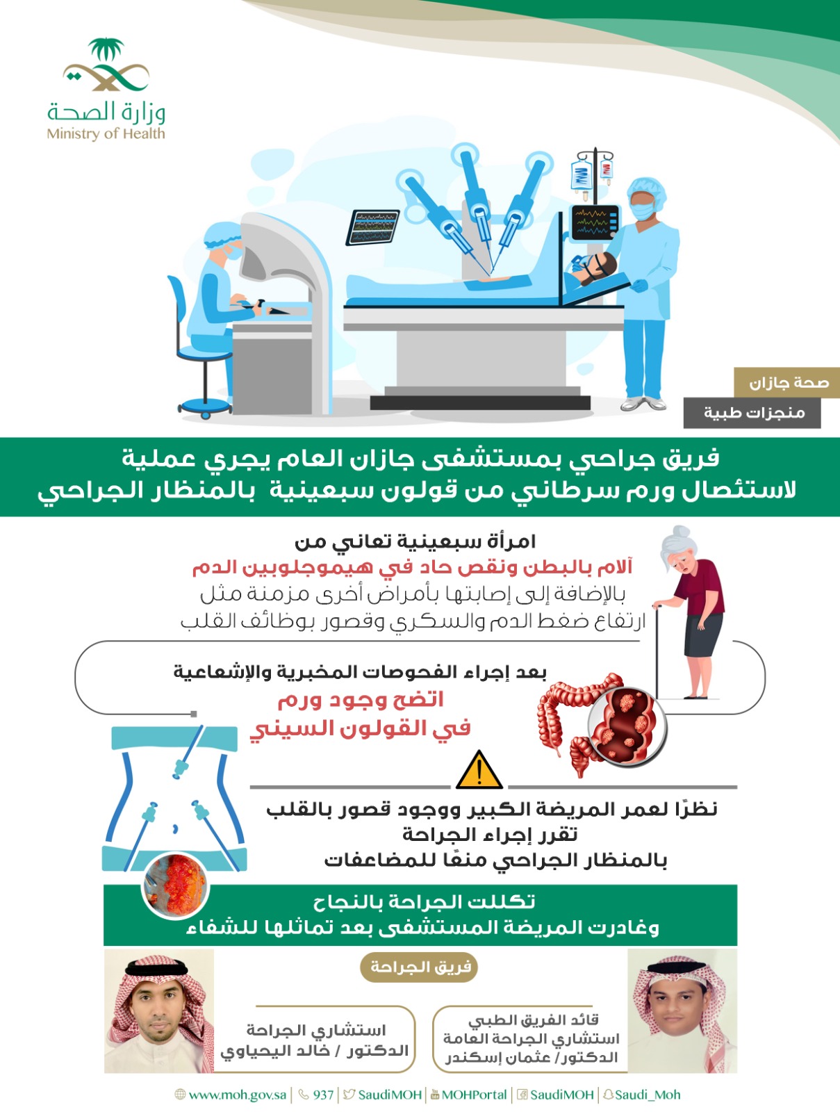 تمكن فريق طبي جراحي بمستشفى جازان العام من استئصال ورم سرطاني من القولون السيني لمريضه سبعينية بالمنظار الجراحي.