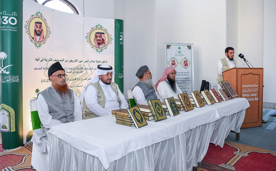 وفي ختام الحفل، سلّم الملحق الديني بسفارة خادم الحرمين بالهند، عددًا من الجمعيات والمؤسسات الإسلامية نسخًا من المصحف الشريف مترجمة إلى اللغات الهندية، كما ستباشر الملحقية الدينية توزيع الهدية خلال أيام شهر رمضان المبارك على الجمعيات والمراكز الإسلامية.