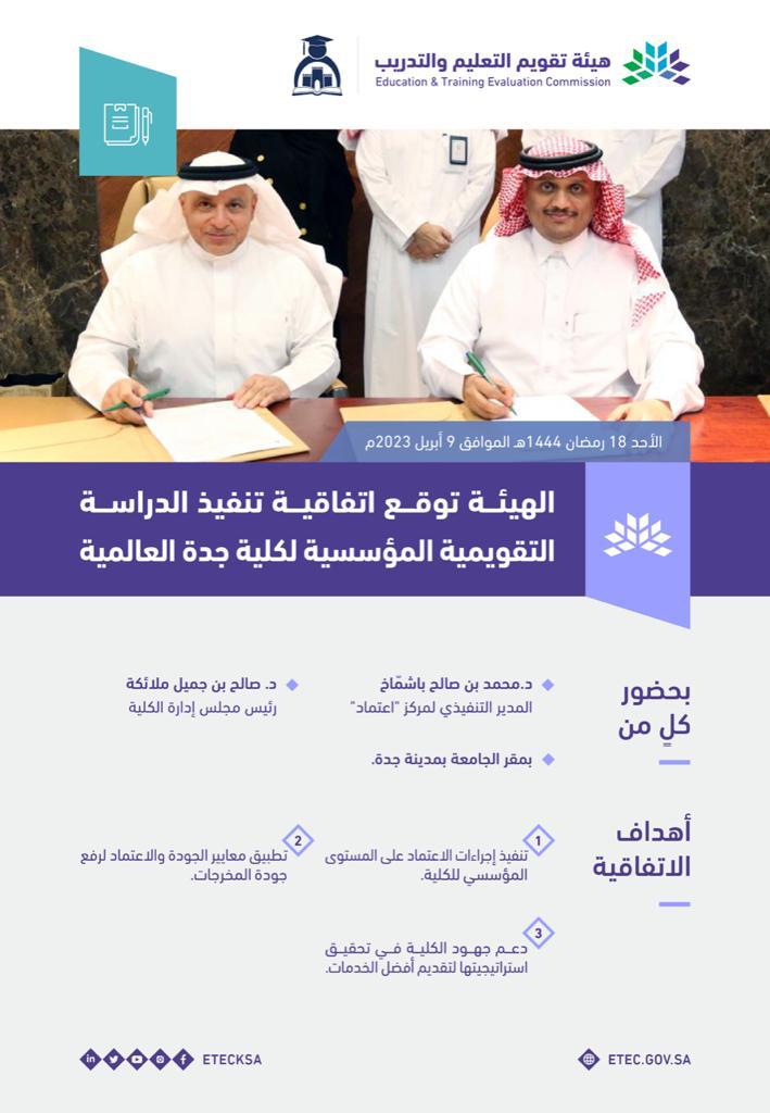 وقّعت هيئة تقويم التعليم والتدريب، ممثلةً في المركز الوطني للتقويم والاعتماد الأكاديمي، اليوم الأحد 18 رمضان 1444هـ الموافق 9 أبريل 2023م، اتفاقية تنفيذ الدراسة التقويمية على المستوى المؤسسي لكلية جدة العالمية، وذلك بمقر الكلية بمدينة جدة.