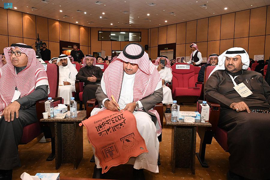 من جانبه أوضح عميد كلية العلوم الإنسانية الدكتور خالد بن سعيد أبوحكمة أن هذه الفعالية تأتي ضمن جهود الجامعة للحفاظ على التراث الثقافي وتعزيز الدور المحوري للشعر في الثقافة العربية، وتعزز من جانب آخر دور الجزيرة العربية وشعرائها في بناء التاريخ الأدبي والفكري للتراث العربي بعد أن صدرت موافقة مجلس الوزراء بتسمية عام 2023 بعام الشعر العربي تعميقاً للاعتزاز بالتراث والإبداع وتأصيلاً لدور الجزيرة العربية وطناً لثقافة العرب وانجازهم الحضاري ولما للشعر من مكانة ثقافية بوصفه من أهم المكونات الحضارية للثقافة العربية، وترسيخه ليكون حاضراً في الحياة اليومية للثقافة السعودية والعربية وإحياء تاريخ الشعر العربي العريق لتعزيز حضوره في الحضارة الإنسانية وإرساء قواعد ثرائه المستقبلي واحلال مكانته المستحقة بين آداب العالم وفنونه.