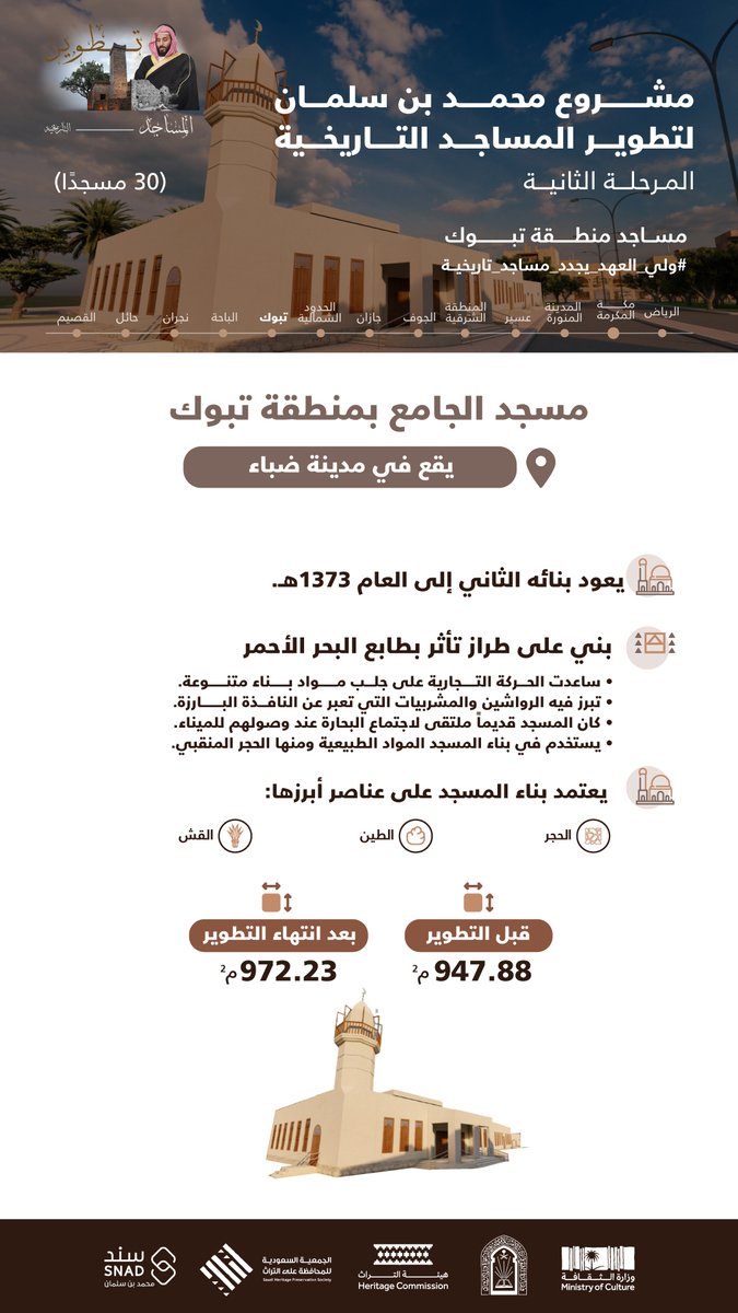 أخبار محلية > مشروع الأمير محمد بن سلمان لتطوير المساجد التاريخية يضم مسجد الجامع في ضباء ويحافظ على هويته المعمارية