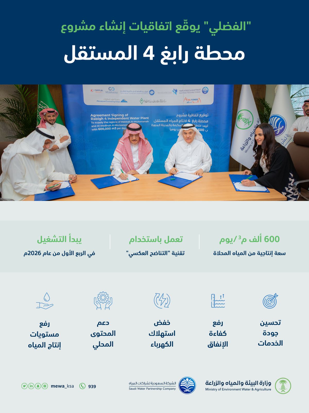وقّع معالي وزير البيئة والمياه والزراعة، رئيس مجلس المديرين للشركة السعودية لشراكات المياه، المهندس عبد الرحمن بن عبد المحسن الفضلي بمقر الوزارة اليوم، اتفاقيات إنشاء مشروع محطة رابغ 4 لإنتاج المياه المستقل بمحافظة رابغ في منطقة مكة المكرمة، بسعة إنتاجية تبلغ 600 ألف متر مكعب من المياه المحلاة يوميًّا.