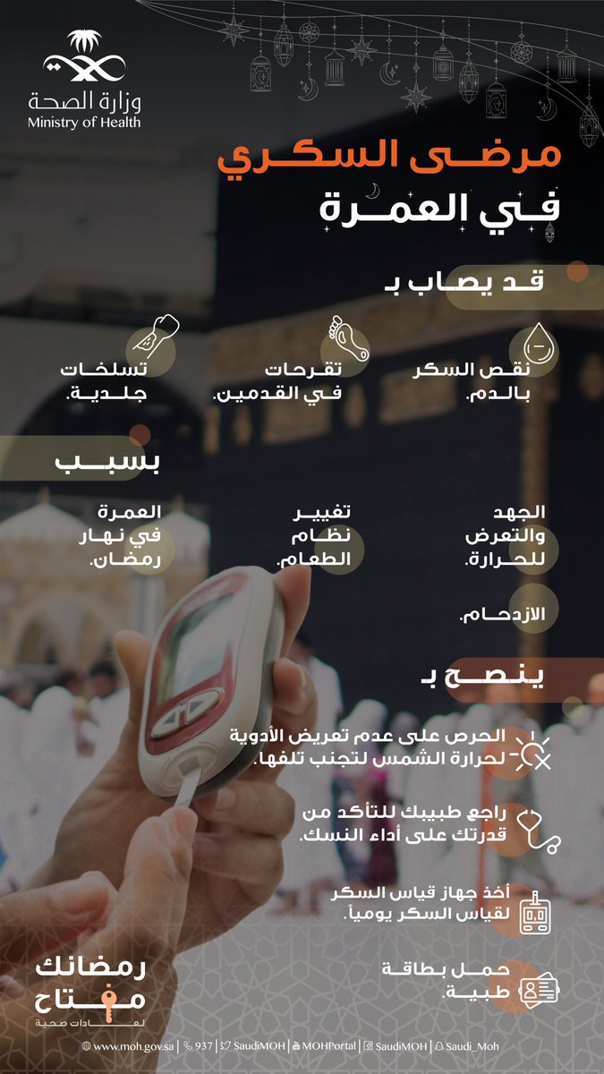 وأوضحت وزارة الصحة أهمية أخذ المصاب بالسكري، جهاز القياس، وحمل بطاقة تعريفية طبية؛ وذلك أثناء أدائه للعمرة.
