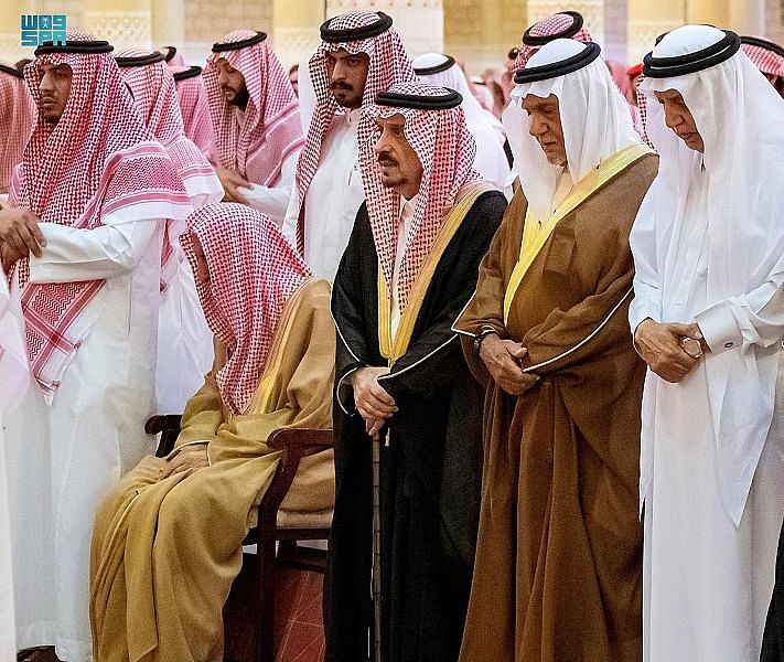 وأدّى الصلاة مع سموه: سماحة مفتي عام المملكة رئيس هيئة كبار العلماء وإدارة البحوث العلمية والإفتاء الشيخ عبدالعزيز بن عبدالله آل الشيخ، والأمير تركي الفيصل بن عبدالعزيز، والأمير تركي بن عبدالله بن عبدالرحمن، والأمير سعود بن سعد بن عبدالعزيز، والأمير خالد بن سلطان بن عبدالعزيز، والأمير خالد بن سعد بن عبدالعزيز، والأمير متعب بن ثنيان بن محمد، والأمير خالد بن بندر بن عبدالعزيز مستشار خادم الحرمين الشريفين، والأمير منصور بن متعب بن عبدالعزيز وزير الدولة عضو مجلس الوزراء، والأمير محمد بن مشاري بن عبدالعزيز، والأمير نواف بن محمد بن عبدالله، والأمير فيصل بن محمد بن سعود بن عبدالعزيز، والأمير فهد بن تركي بن عبدالعزيز، والأمير عبدالعزيز بن سطام بن عبدالعزيز مستشار خادم الحرمين الشريفين، وصاحب السمو الأمير بندر بن سلمان بن محمد، وصاحب السمو الملكي الأمير الفريق الركن تركي بن بندر بن عبدالعزيز قائد القوات الجوية الملكية السعودية.