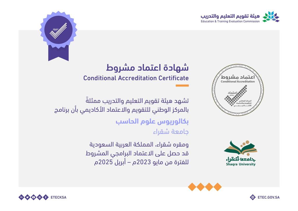 حصل برنامج بكالوريوس علوم الحاسب بجامعة شقراء، اليوم الأحد 1444/10/10هـ، على الاعتماد البرامجي المشروط حتى أبريل 2025م، من هيئة تقويم التعليم والتدريب ممثلة بالمركز الوطني للتقويم والاعتماد الأكاديمي.