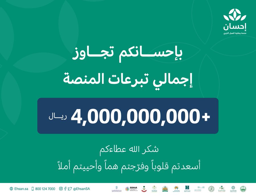اجتماعي / تبرعات منصة “إحسان” للعمل الخيري تتجاوز مبلغ 4 مليارات ريال صُرفت في أكثر من 23 مجالاً خيريًا في المملكة
