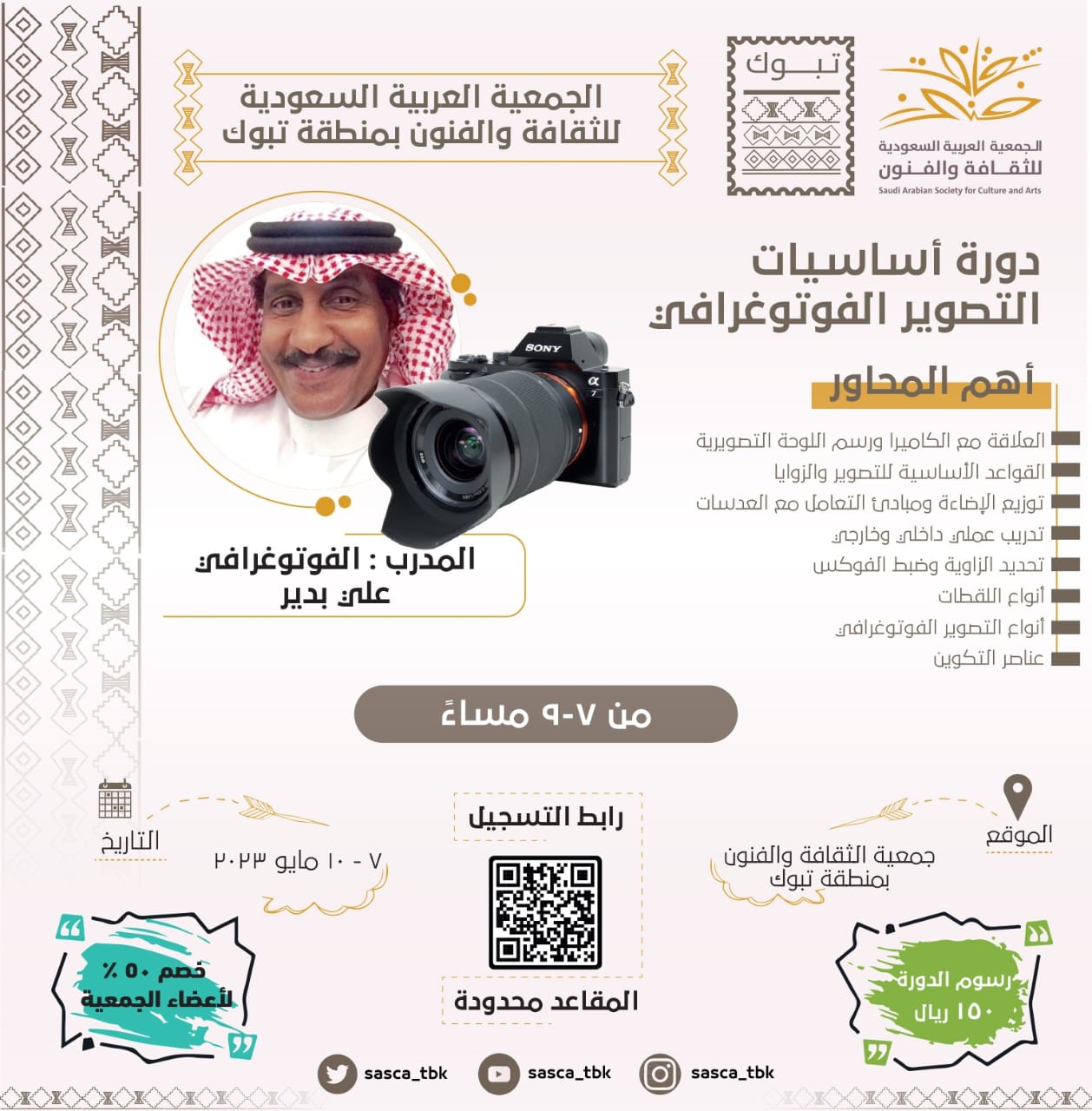 تقيم الجمعية العربية السعودية للثقافة والفنون بمنطقة تبوك ممثلة بلجنة التصوير الضوئي مساء غدٍ الأحد دورة تدريبية في أساسيات التصوير الفوتوغرافي يقدمها المدرب والمصور / علي بدير ولمدة أربعة أيام بمقر الجمعية بحي المهرجان .