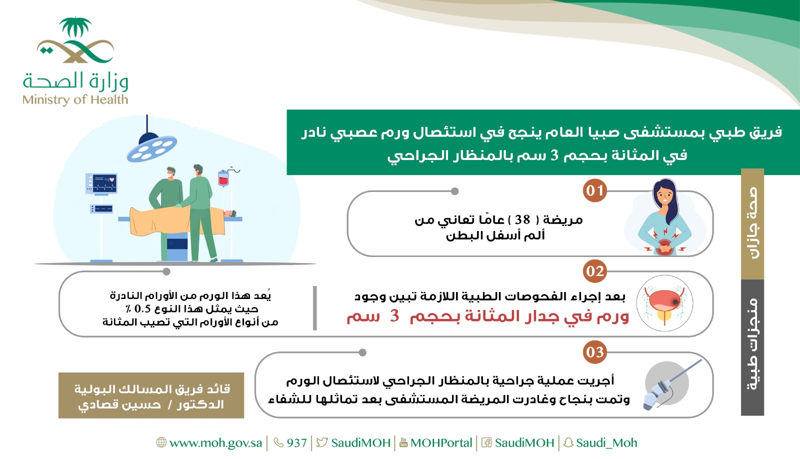 تمكن فريق المسالك البولية بمستشفى صبيا العام من استئصال ورم عصبي نادر في جدار المثانة لمريضة تبلغ من العمر 38 عاما بالمنظار الجراحي.