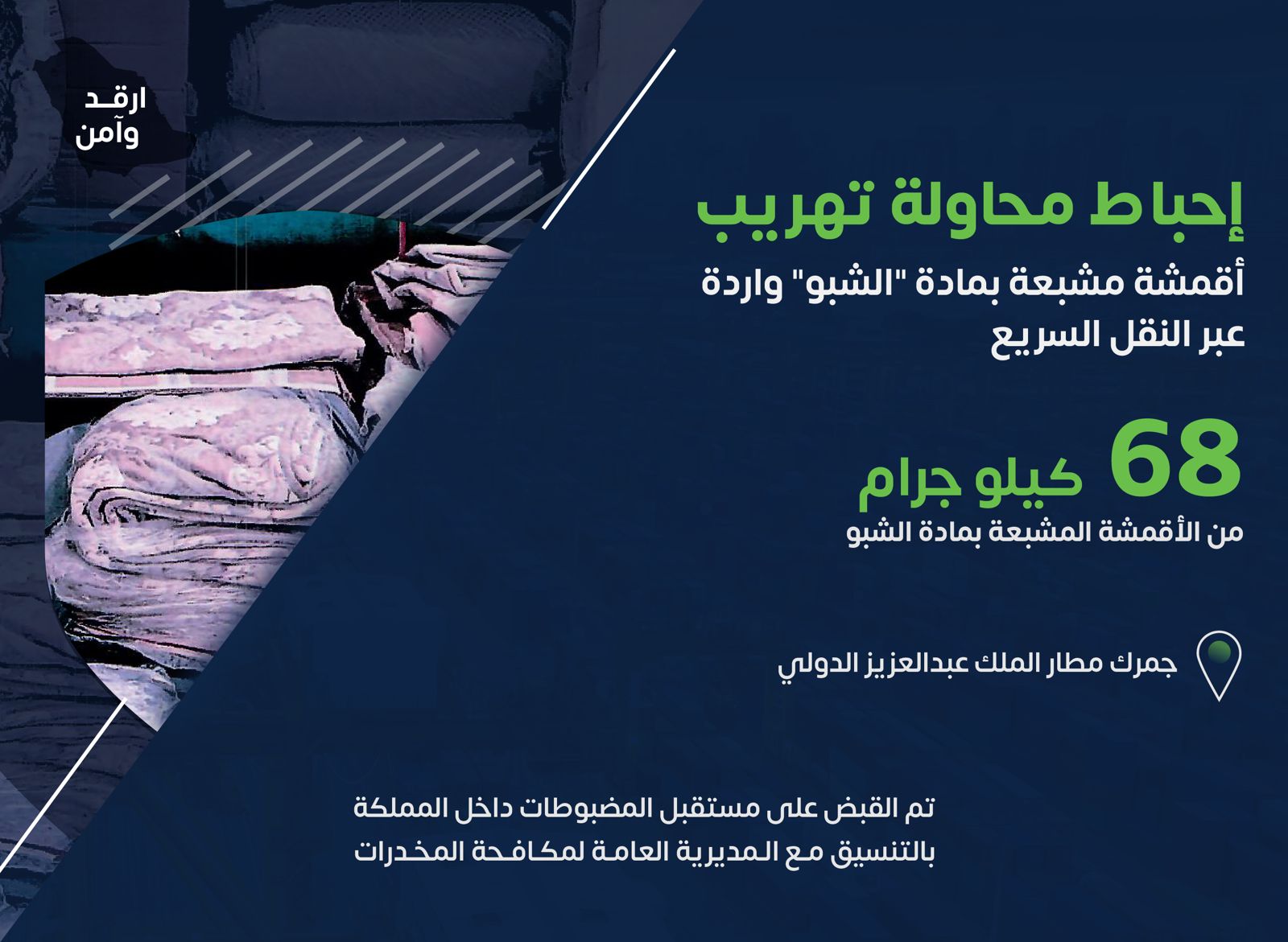 تمكنت هيئة الزكاة والضريبة والجمارك في مطار الملك عبدالعزيز الدولي بجدة من إحباط محاولة تهريب 68 كيلوجرام من الأقمشة المشبعة بمادة “الشبو”.