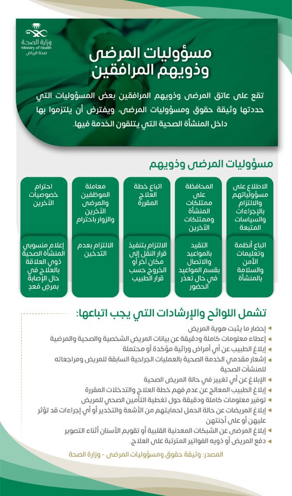 وشددت صحة الرياض على المستشفيات والمراكز الصحية التابعة لها على وضع نصوص هذه الوثيقة على مكان بارز في المنشأة الصحية للأطلاع عليها من قبل المرضى والمراجعين وذويهم، والالتزام بها والإجابة على استفسارات الجميع ومعالجة الشكاوى والمقترحات أولاً بأول .