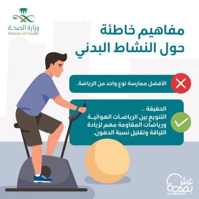 وأوضحت الوزارة، عبر حساب منصتها التوعوية “عش بصحة” على “تويتر”، أن مفهوم أفضلية ممارسة نوع واحد من الرياضة من المفاهيم الخاطئة حول النشاط البدني، موضحة أن الحقيقة هي أن “التنويع بين الرياضات الهوائية ورياضات المقاومة مهمٌ لزيادة اللياقة وتقليل نسبة الدهون”.