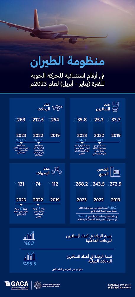 أعلنت الهيئة العامة للطيران المدني عن تحقيق نمو أرقام الحركة الجوية خلال الأربع الأشهر الأولى لعام 2023م مقارنة بنفس الفترة من العام الماضي، مسجلةً زيادة بنسبة 42% في أعداد المسافرين، حيث بلغ عدد المسافرين حوالي 35.8 مليون مسافر مقارنة بنفس الفترة من العام الماضي والبالغة 25.3 مليوناً، فيما بلغ عدد الرحلات حوالي 263 ألف رحلة تقريباً بزيادة 23.5% مقارنة بنفس الفترة من العام الماضي، التي بلغت 212.5 ألف رحلة، كما ارتفعت عدد الوجهات إلى 131 وجهة بزيادة 57 وجهة مقارنة بـ 74 وجهة بنفس الفترة لعام 2022م، وبزيادة 19 وجهة لنفس الفترة في عام 2019 (فترة الجائحة) والتي بلغت فيها حوالي 112 وجهة.