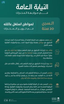 وأوضح المصدر أنه بإحالة المتهم إلى المحكمة المختصة، وتقديم الأدلة على اتهامه، صدر بحقه حكم يقضي بإدانته بما نسب إليه، وسجنه مدة (20) سنة، وتغريمه مائة ألف ريال.