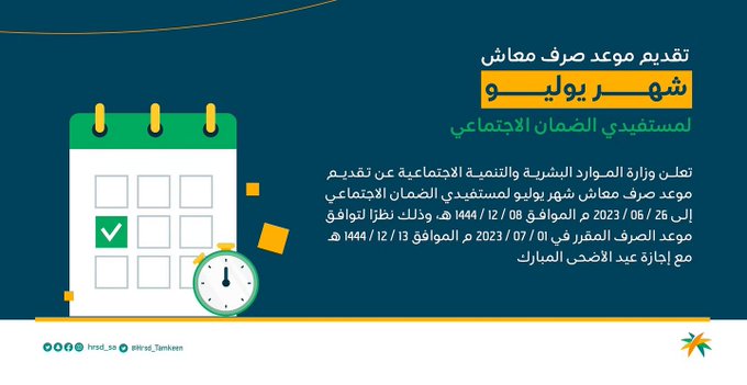 أعلنت وزارة الموارد البشرية والتنمية الاجتماعية عن تقديم موعد صرف معاشات شهر يوليو لمستفيدي الضمان الاجتماعي إلى 26 يونيو الجاري.