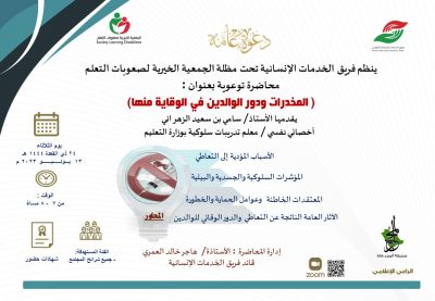 تعزيزًا وتظافرًا مع دور الجهات الحكومية ،والخاصة والقطاع الثالث في إقامة حملة مكافحة السموم للحد من ظواهر سلبية تؤثر على حياة سعيدة بسبب انتشار السلوكيات الإجرامية وغياب العقل البشري والعيش في نكد دائما ؛ لذا ينظم فريق الخدمات الإنسانيةالتطوعي التابع للجمعية الخيرية لصعوبات التعلم محاضرة توعوية بعنوان (المخدرات ودور الوالدين للوقاية منها)