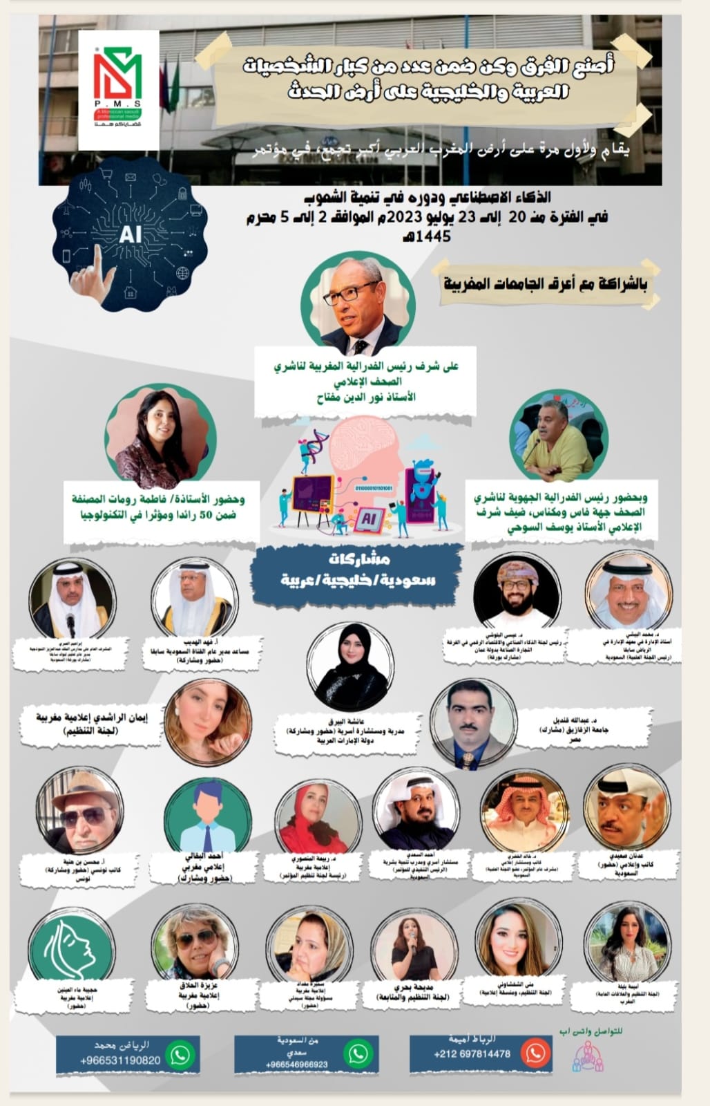من المقرر أن يعقد مؤتمر الذكاء الاصطناعي ودوره في تنمية الشعوب، كأول مؤتمر يناقش هذا الجانب، تحت شعار (اصنع الفرق وكن ضمن عدد من كبار الشخصيات العربية على أرض الحدث)، وذلك في المغرب العربي من 20 إلى 23 يوليو القادم.