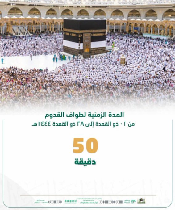 وقالت “رئاسة الحرمين”، عبر حسابها على “تويتر”، إن المدة الزمنية لطواف القدوم خلال الفترة من غرة ذي القعدة إلى 28 ذو القعدة 1444هـ، هي 50 دقيقة.