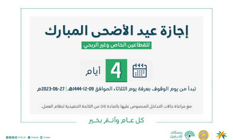 أعلنت وزارة الموارد البشرية والتنمية الاجتماعية موعد إجازة عيد الأضحى المبارك للقطاعين الخاص وغير الربحي.