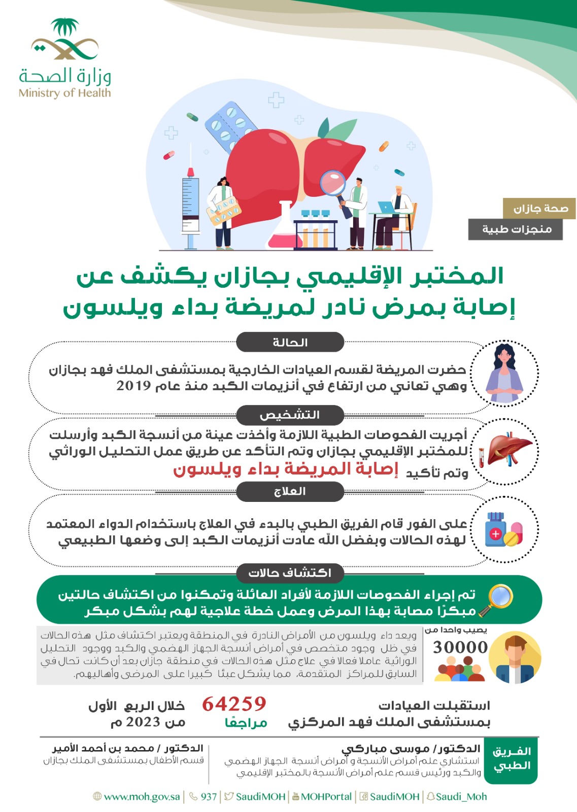ويعد داء ويلسون من الأمراض النادرة في المنطقة حيث يصيب شخص في كل 30000 نسمة ويعتبر اكتشاف مثل هذه الحالات في ظل وجود متخصص في أمراض أنسجة الجهاز الهضمي والكبد ووجود التحليل الوراثية عاملا فعالا في علاج مثل هذه الحالات في منطقة جازان بعد أن كانت تحال في السابق للمراكز المتقدمة، مما يشكل عبئا كبيرا على المرضى وأهاليهم.