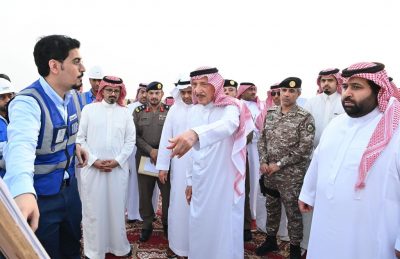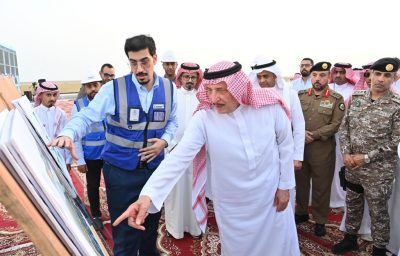 ووقف سمو أمير المنطقة ميدانيا المشروع وبعض القرى المجاورة له واستمع لشرح من منسوبي الهيئة العامة للطيران المدني والشركات المنفذة للمشروع لشرح مفصل عن سير العمل بالمطار الجديد الذي يقام على مساحة تبلغ “٥٠،١٣٤،١٥٥”متراً مربعاً، وصمم ليخدم “٢،٤٠” مليون راكب في العام من خلال الرحلات الداخلية والدولية، وتم تزويده بخمس بوابات سفر بكل بوابة جسرين ليكون إجمالي عدد الجسور “١٠” جسور خاصة بحركة الركاب من الطائرة للمطار ونسب الانجاز التي بالمشروع التي بلغت ٥٣٪.