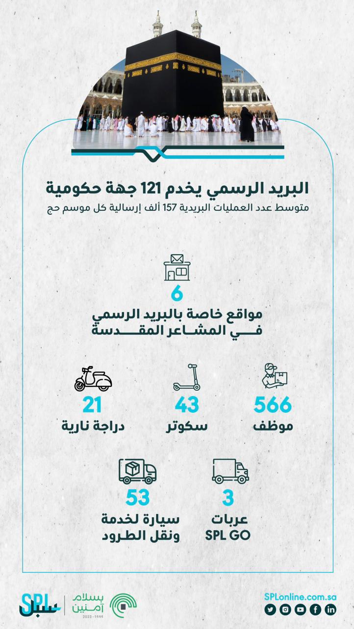 تواصل مؤسسة البريد السعودي | سبل مشاركاتها السنوية في موسم الحج، كمنظومة وطنية تقدم العديد من الخدمات التي من أهمها البريد الرسمي، حيث يبلغ متوسط عدد العمليات البريدية 157 ألف إرسالية كل موسم حج في مكة المكرمة والمشاعر المقدسة والمدينة المنورة.