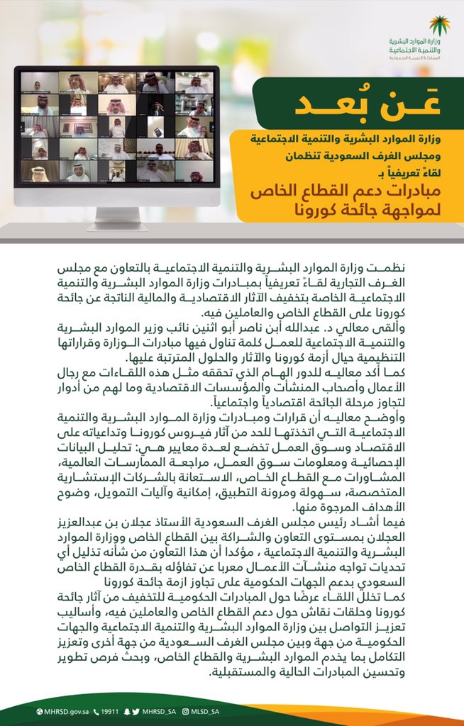 نظمت وزارة الموارد البشرية والتنمية الاجتماعية بالتعاون مع مجلس الغرف التجارية لقاءً تعريفياً بمبادرات وزارة الموارد البشرية والتنمية الاجتماعية الخاصة بتخفيف الآثار الاقتصادية والمالية الناتجة عن جائحة فيروس كورونا المستجد على القطاع الخاص والعاملين فيه.