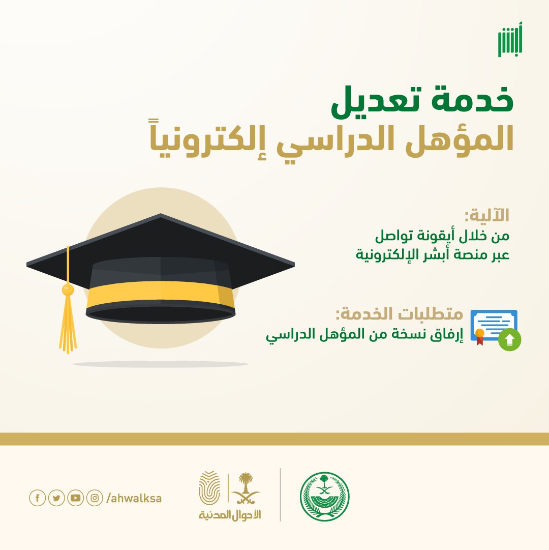 “#الأحوال_المدنية”: خدمة تعديل المؤهل الدراسي متاحة إلكترونيًّا عبر “#أبشر”.